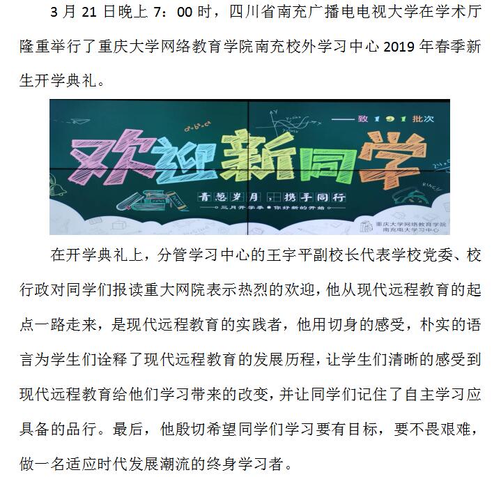 重庆大学网络教育学院南充学习中心隆重举行2019年春季新生开学典礼