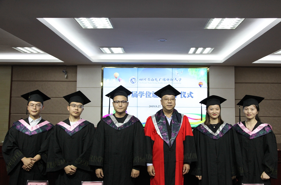 图为南充电大副校长王旗(右三)与2019届学士学位获得者代表合影