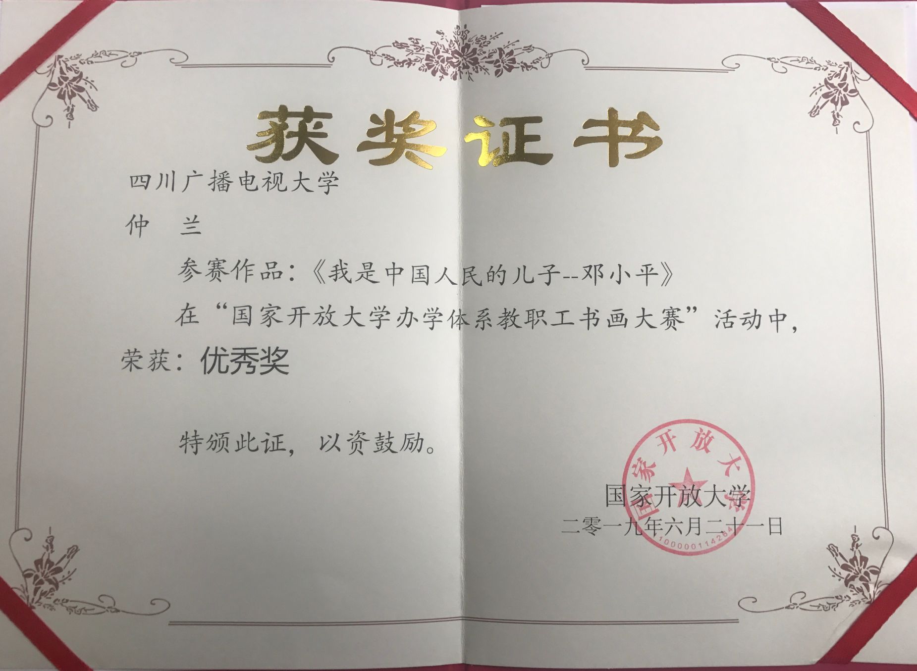 2018年6月,为纪念邓小平批示创办广播电视大学40周年,凝聚办学体系合力,打造文化品牌,国家开放大学举办了主题为“弹指四十年,芳华满人间”的办学体系教职工书画大赛。