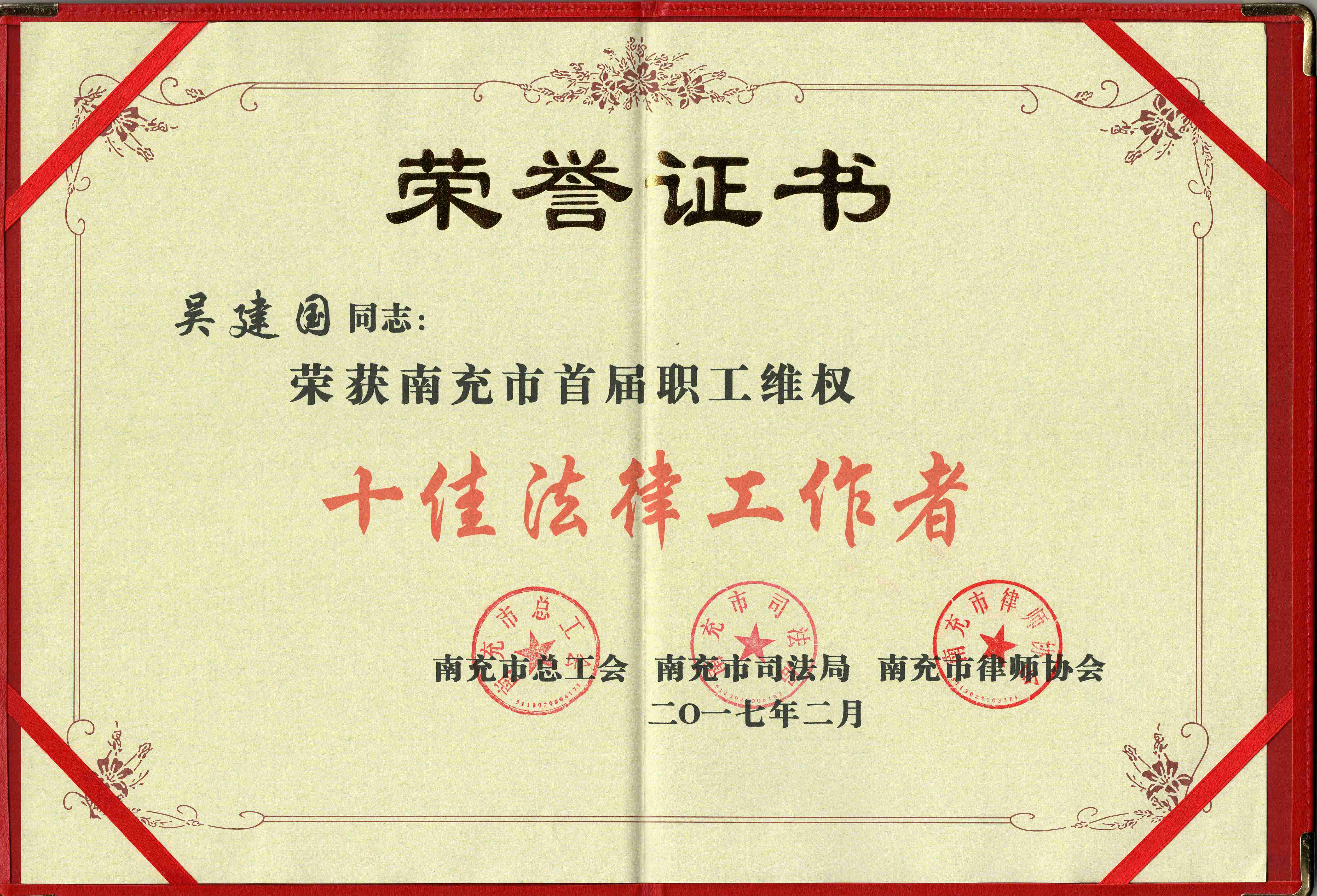 吴建国说,从事律师行业8年来,他先后收到20多名民工送来的锦旗;分别在2016年荣获第四届“四川省维护职工权益杰出律师”入围奖、2017年被中国果州网授予最美维权律师、2017年荣获四川省总工会首届争当优秀调解员、争做优秀法律援助工作者工作竞赛先进个人、2017年荣获南充市首届职工维权十佳法律工作者、2017年和2018年连续两年被评为高坪区职工法律援助维权工作先进个人、2018年被评为四川辽原律师事务所杰出贡献个人、2018年荣获南充市法治扶贫优秀律师。