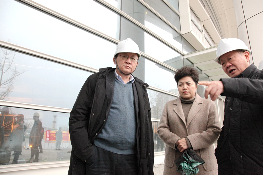 昝平(右一)向尹析明(左一)介绍南充大剧院升级装修情况