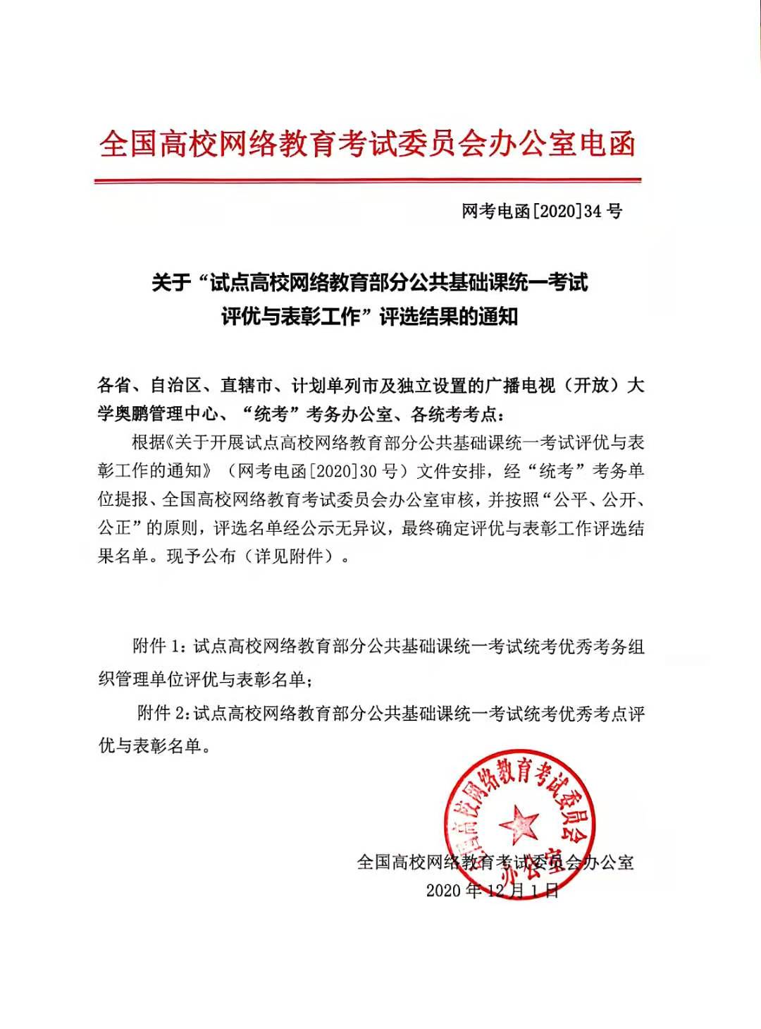 2020年11月,网考办开展试点高校网络教育部分公共基础课统一考试考点检查与评优工作,我校凭借完备的设施和优异的组考工作,从全国各地众多考点中脱颖而出,再次获得“全国统考优秀考点”荣誉称号。