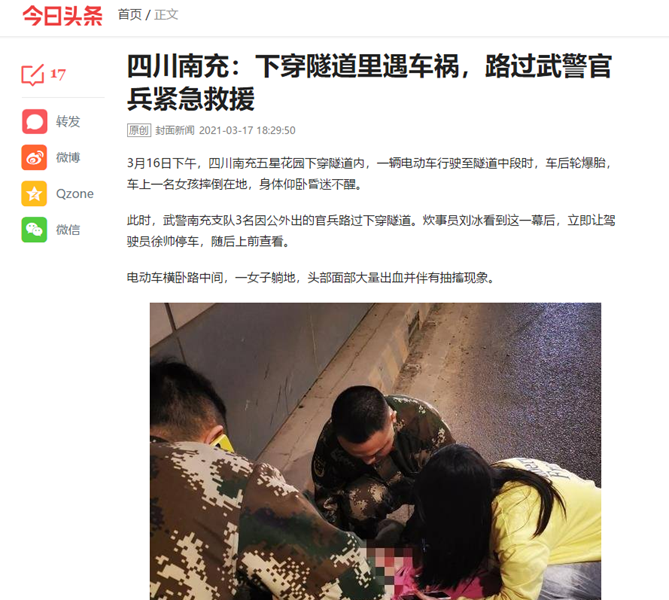 据四川报业集团《封面新闻》报道,3月16日下午,南充广播电视大学2019秋季法学班的刘冰(武警南充支队战士)和战友因公外出,路过四川南充五星花园下穿隧道时,看到一名女孩因电瓶车爆胎摔倒在地,身体仰卧、昏迷不醒,看到这一幕后,刘冰立即让驾驶员徐帅靠边停车,开启车辆双闪,在事故前方设立三角警示架,拨打急救电话后迅速展开对女孩的抢救。时间就是生命,在刘冰等人的有效帮助下,女孩避免了二次伤害,成功等到救援。