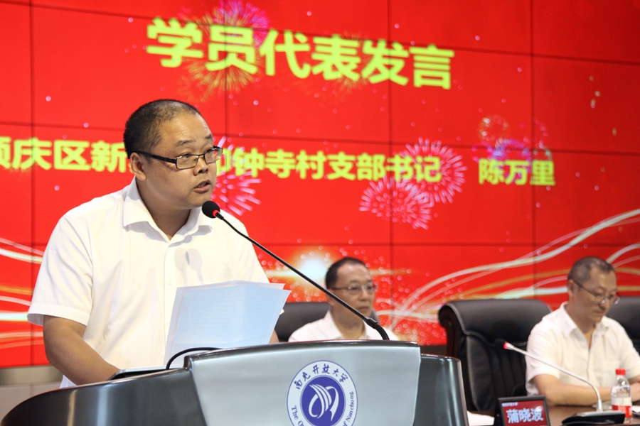 会上,顺庆区学员代表陈万里作郑重表态,在今后的两年半时间里,一要严格遵守学校各项安排,虚心学习、认真听讲,保质保量完成各阶段学习任务;二要严格遵守课堂纪律,要充分展示基层干部队伍的良好形象;三要正确处理好工学矛盾,不负组织的信任和期望。