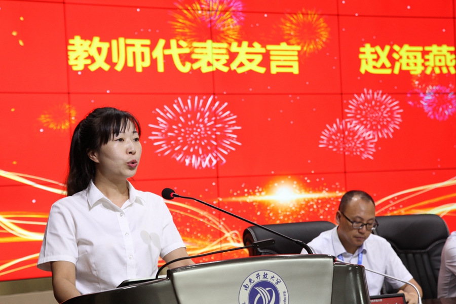 教师代表赵海燕和新生代表张爱在典礼上作了发言。
