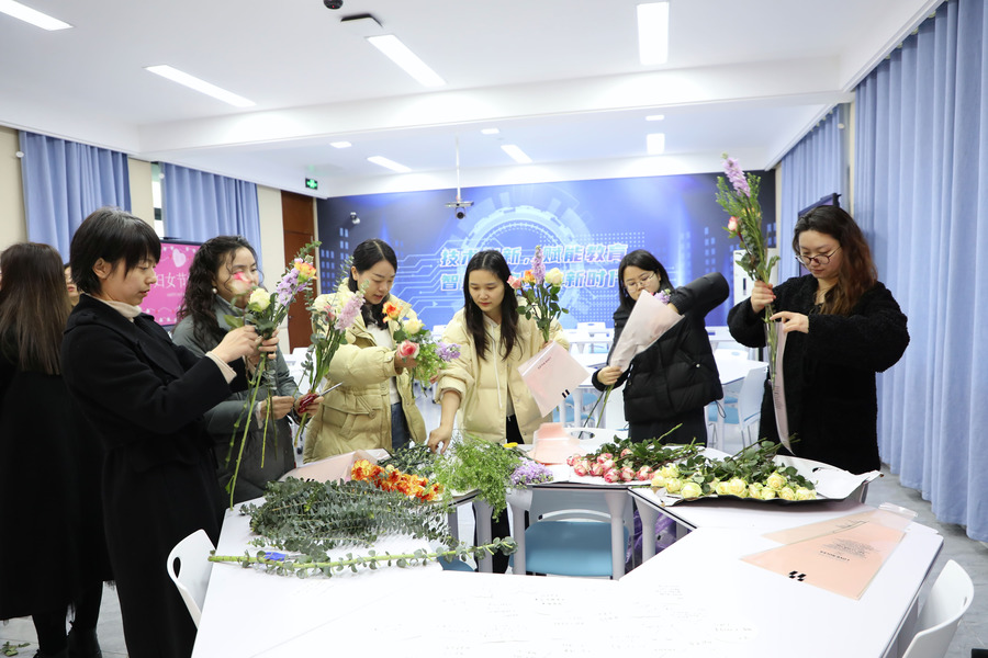 上午10时,四楼智慧教室化身温馨花艺工坊,全体女教职工齐聚一堂参与创意包花活动。工会提前准备的玫瑰、康乃馨等鲜花与各色装饰材料整齐摆放,女教师们巧手翻飞,用丝带缠绕、彩纸装点,将朵朵鲜花编织成独具匠心的花艺作品。活动现场欢声笑语不断,一束束精美的花束不仅承载着对生活的热爱,更彰显了女性教职工的心灵手巧与审美情趣。