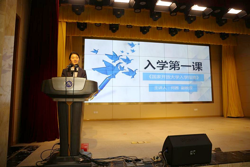 在开学典礼的最后环节,由直属部副主任何茜副教授给新生代表讲解《国家开放大学学习指南》,对开放教育的学习模式,从线上线下学习、考核方式等多角度为新同学们进行了学习方法的指引和讲解。