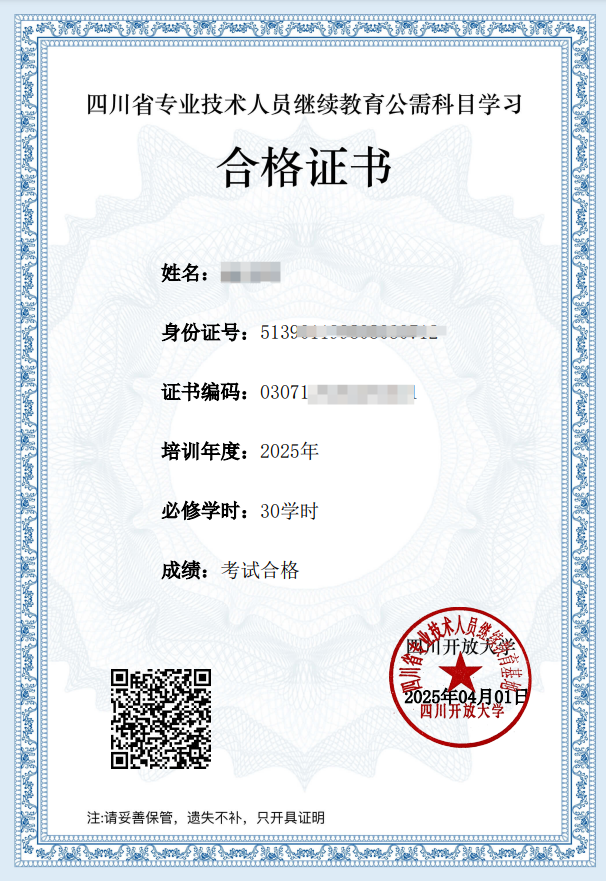 • 权威证书认证:考核通过由省级继续教育基地——四川开放大学颁发电子证书