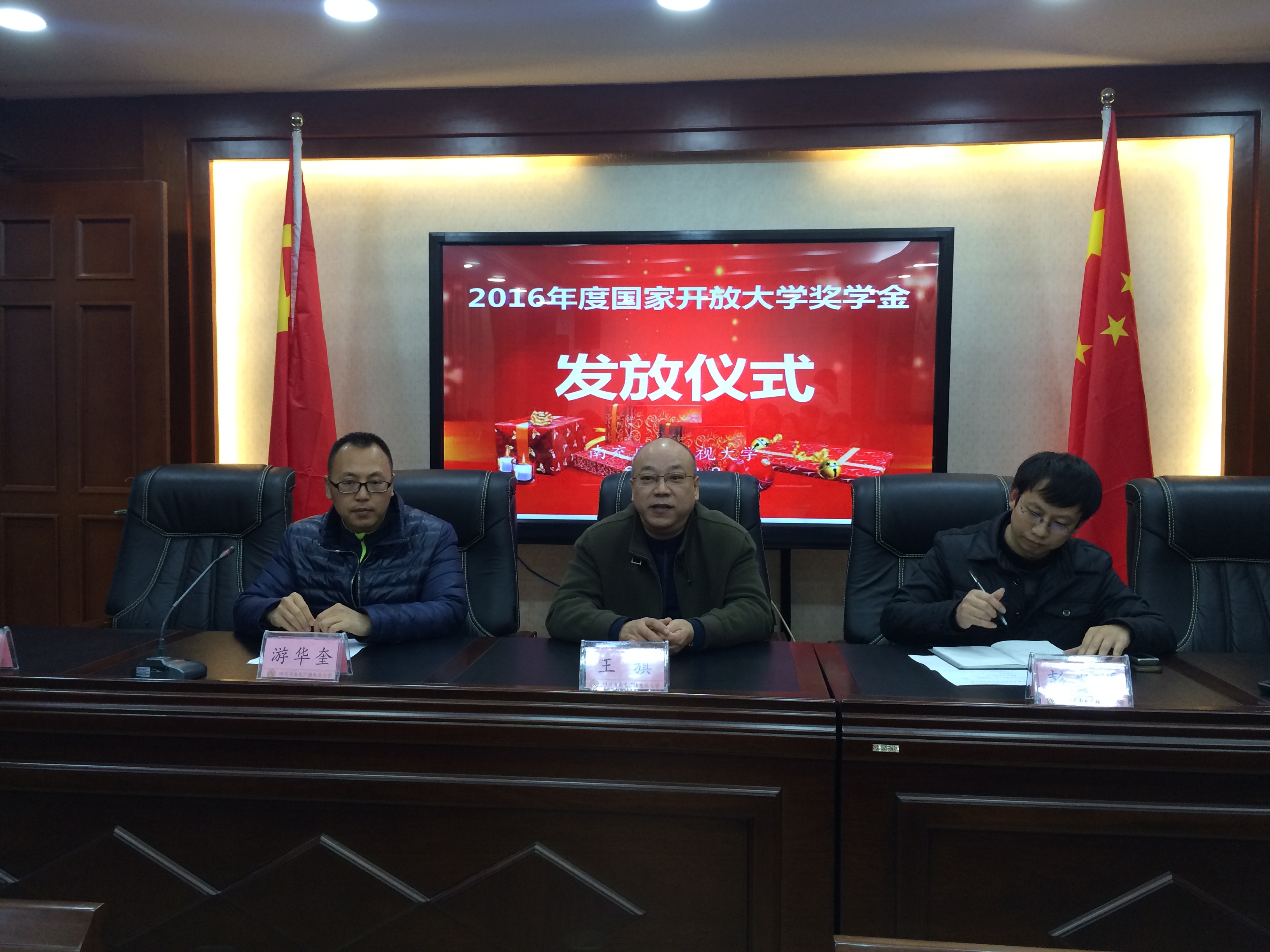 12月8日下午,南充电大举行了2016年度国家开放大学奖学金发放仪式。南充电大副校长王旗为到现场参加领奖的21名同学颁发了证书及奖金。教务处、直属部相关负责人参加了仪式。