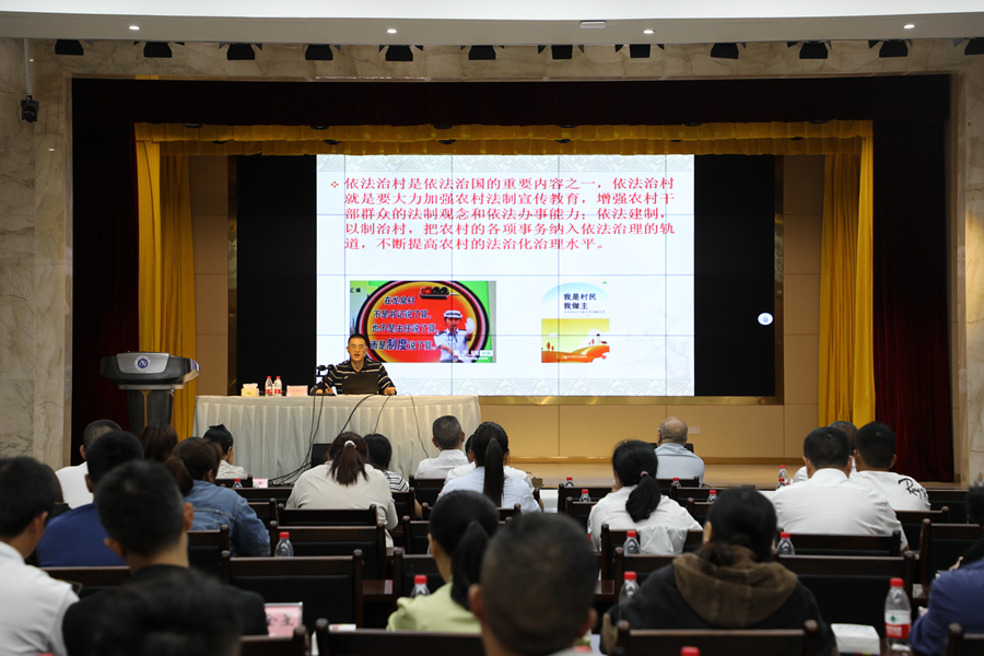 何洪周教授以《增强法治意识,推进依法治村》为题,从弄清“自治”与“法治”、努力增强法治意识、提升依法治村能力三个方面,对依法治村作了深入浅出地阐述,并理论联系实际,对一系列正反案例进行了剖析,以案说法、讲解透彻,事例典型、语言生动,取得了很好的效果。
