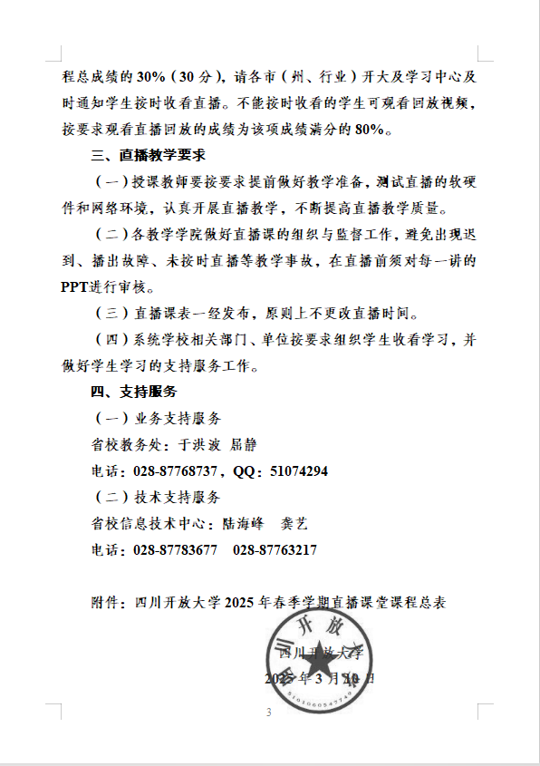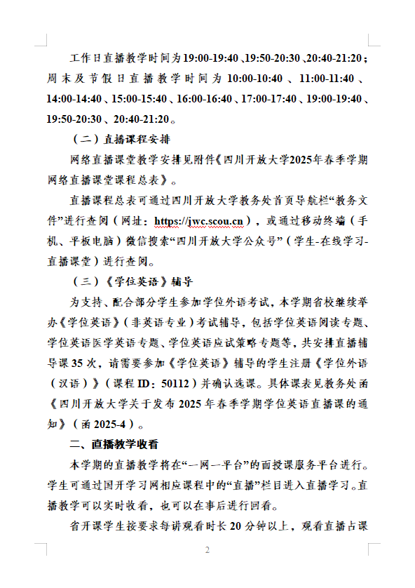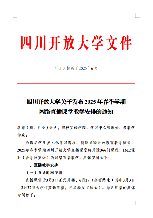 四川开放大学关于发布2025年春季学期网络直播课堂教学安排的通知.doc