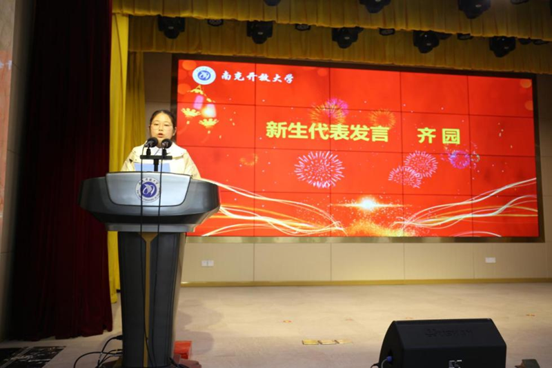 ▲新生代表齐园同学发言