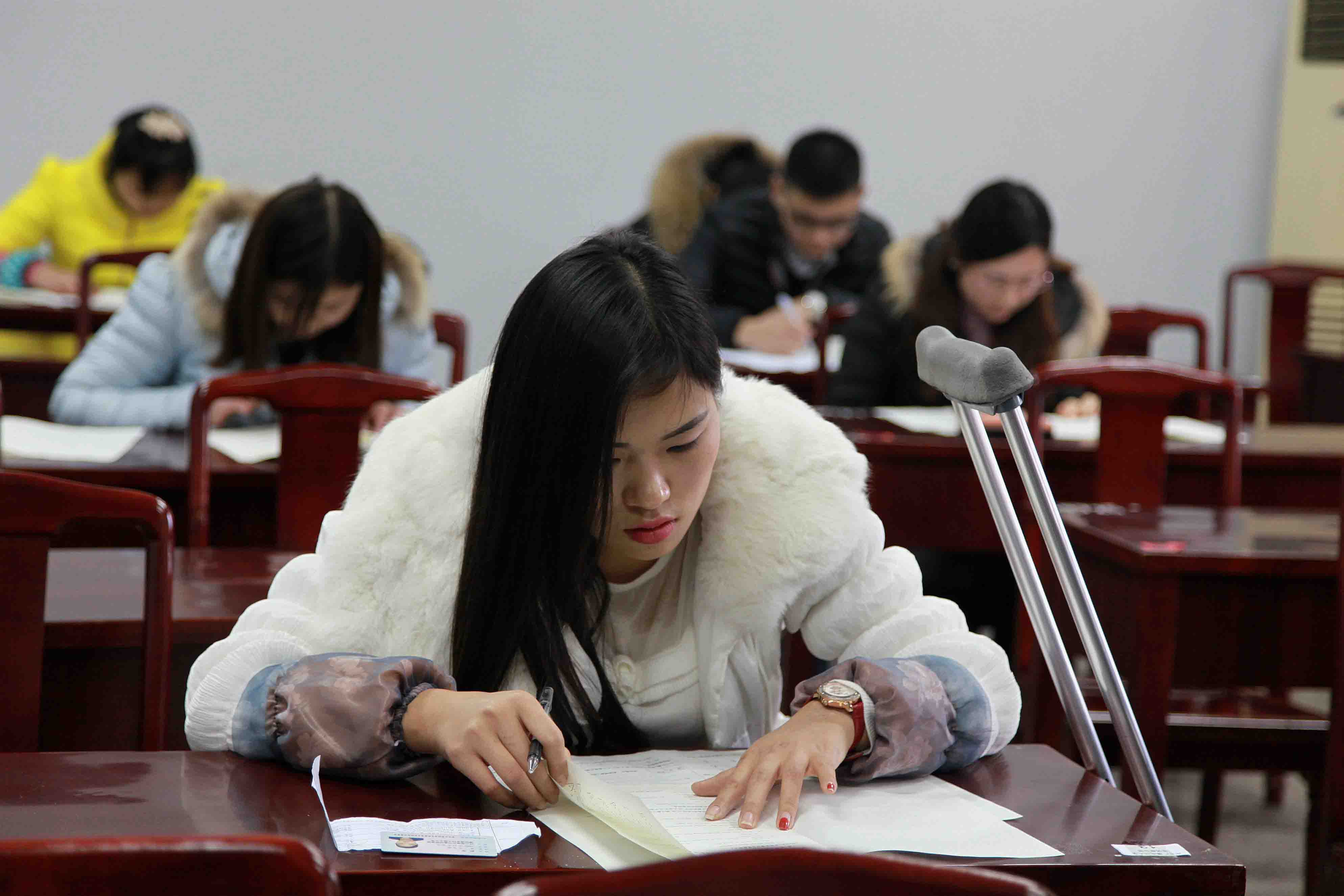 图为2015年秋季行管专科赵芳同学拄着拐杖参加期末考试现场