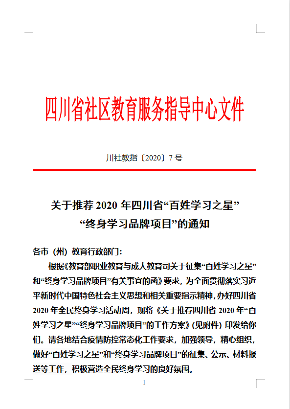 下一篇:四川省社区教育服务指导中心 关于推荐、认定2019年全民终身学习活动周 优秀组织等单位的通知