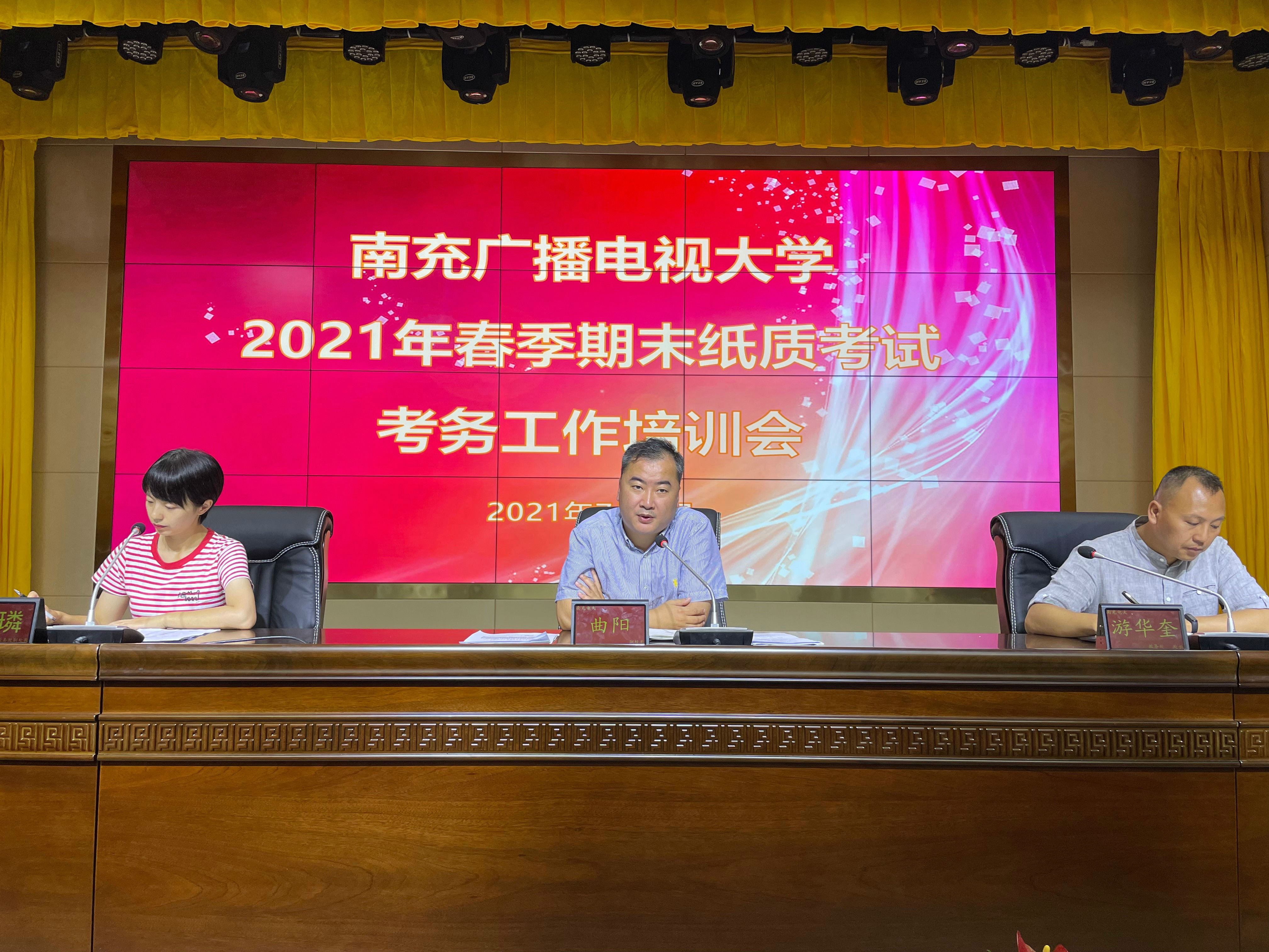 为保证2021年春季期末纸质考试工作的顺利进行,严格规范监考工作程序,2021年7月9日下午,我校召开了2021年春季期末纸质考试考务工作培训会。副校长曲阳、教务处处长游华奎、教务处副处长任璘及全体考务、监考人员共计108人参加了会议。会议由教务处副处长任璘主持,副校长曲阳出席并讲话。