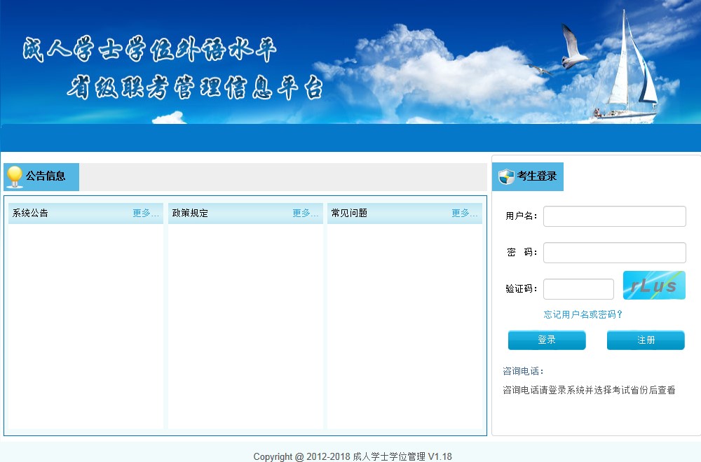 考生应在规定的时间登录“成人学士学位外语考试省级联考管理信息平台”(http://xsxw.ks365.org/cld/f/stu/login/loginStu)进入报名系统注册,并提交报名信息。