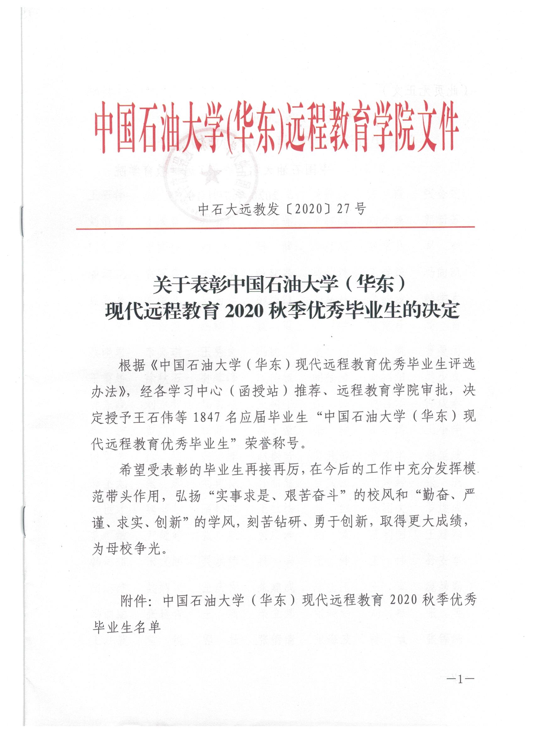 今日获悉,中国石油大学(华东)现代远程教育2020秋季优秀毕业生获奖名单公布。