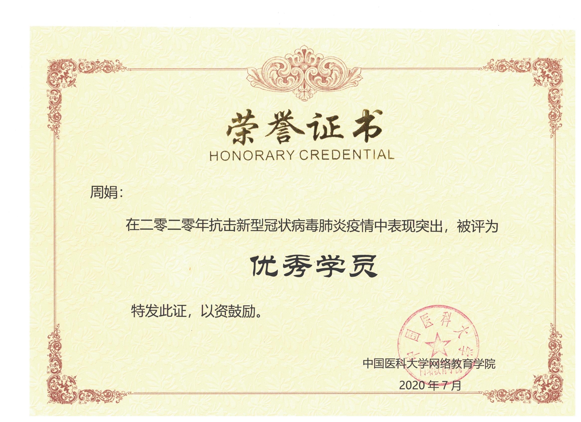 南充电大四川南充奥鹏学习中心中国医科大学网络教育学院2020年秋季护理学专业毕业生周娟,是川北医学院附属医院在2020年春节第一批派往武汉的医护人员,在武汉红会医院从事一线工作,被中国医科大学评为“抗疫优秀学员”。南充电大全体教职工及学生称赞有加。