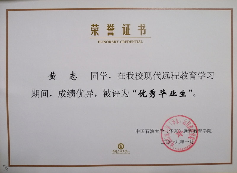 黄志同学就读的中国石油大学(华东)远程教育学院起源于北京石油学院时期1956年开办的函授教育,是石油行业成人高等教育的开启者。2001年,经教育部批准开展现代远程教育,成为当时全国38所试点高校之一,2013年成立远程教育学院。依托中国石油大学(华东)学科优势,远程教育学院构建由石油专业为主、社会通用专业为辅的专业体系,黄志同学就读于化工工艺专业。因为是理工科专业高校加上中国石油大学(华东)专业的特殊性,学生从事的行业往往都在野外郊区,离城区较远,工作环境十分艰苦,网络信号不稳定,这对于网络教育的学生而言,无疑增加了一定的学习难度。黄志同志在克服严峻的工作环境和压力的同时,在南充奥鹏学习中心两年多期间的学习也丝毫没有松懈。