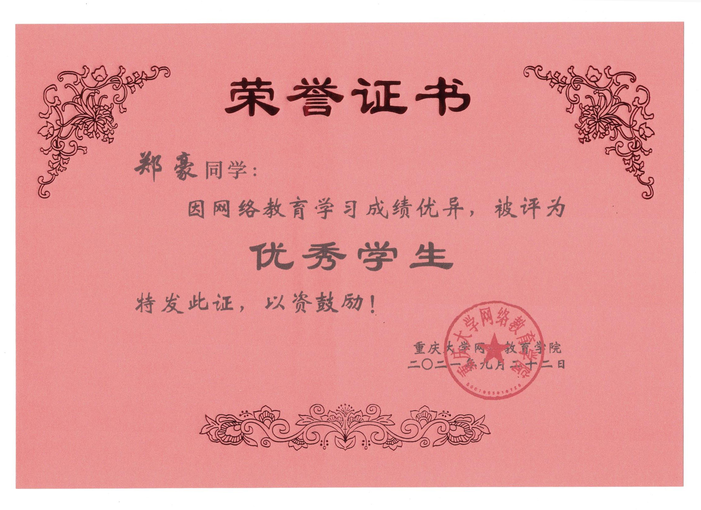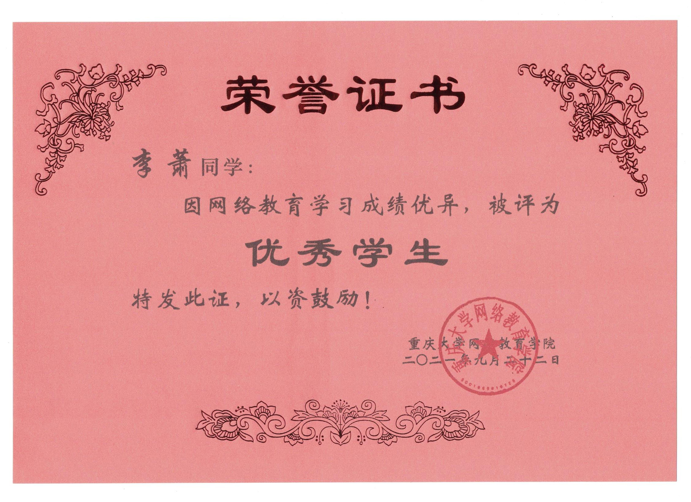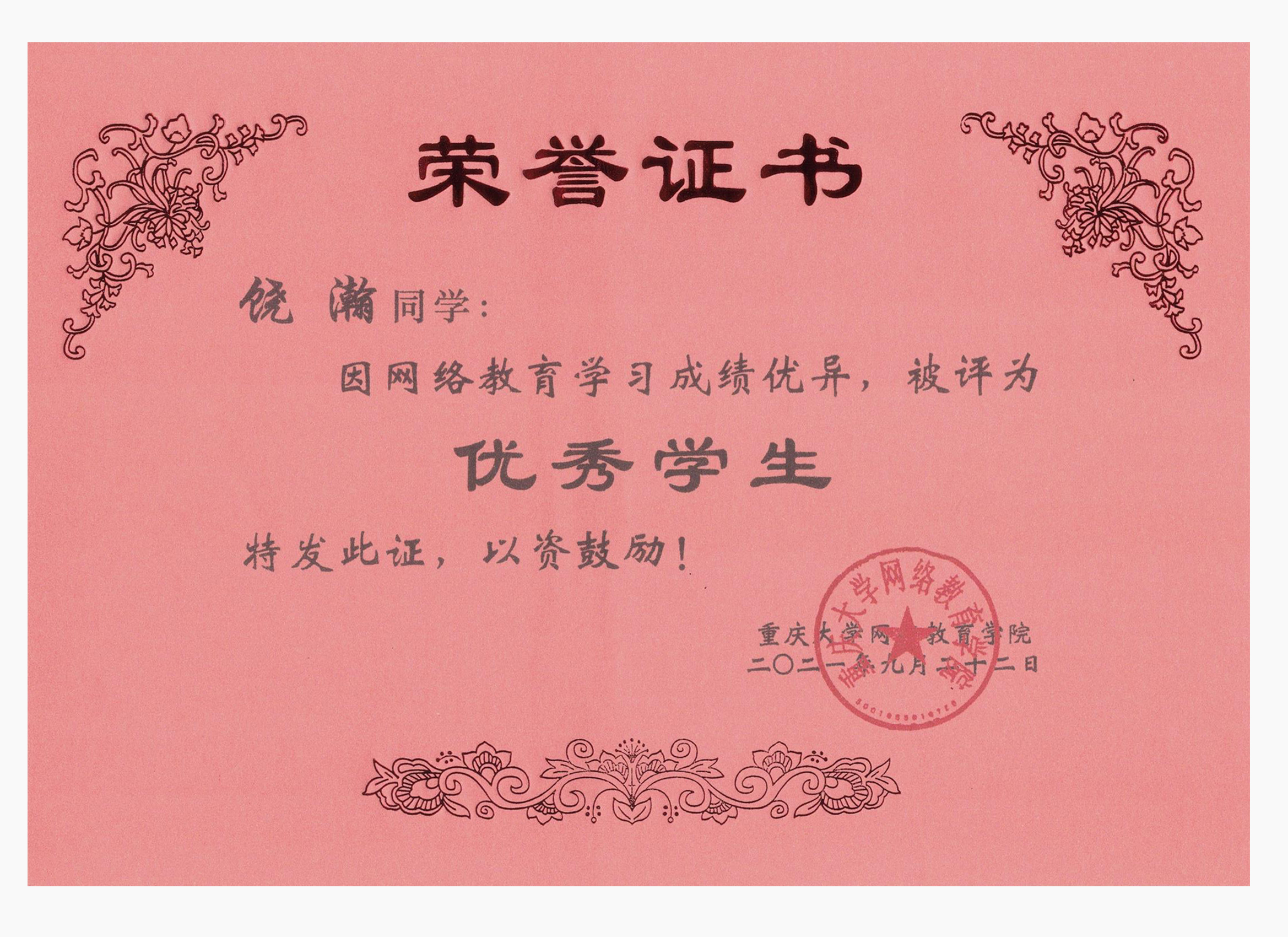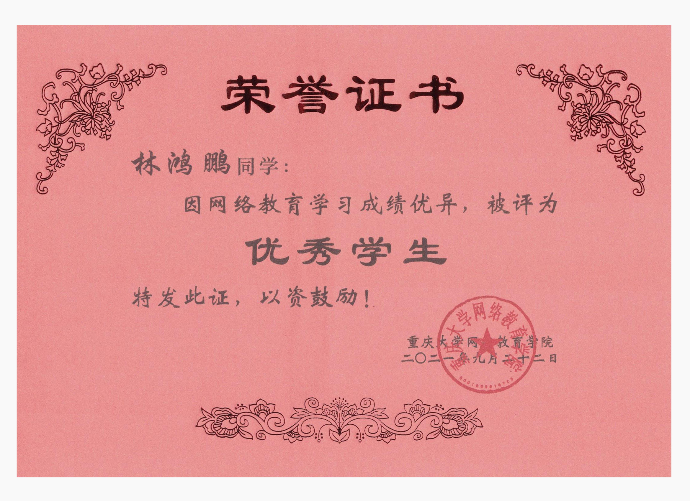 今日获悉,重庆大学网络教育学院2021年春季“优秀学生”获奖名单公布。重庆大学网络教育学院南充校外学习中心学生李萧、林鸿鹏、饶瀚、郑豪四位同学荣获“优秀学生”称号。