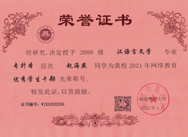 福建师范大学网络教育学院南充开放大学学习中心赵海燕同学,被评为福建师范大学2021年网络教育“优秀学生干部”。