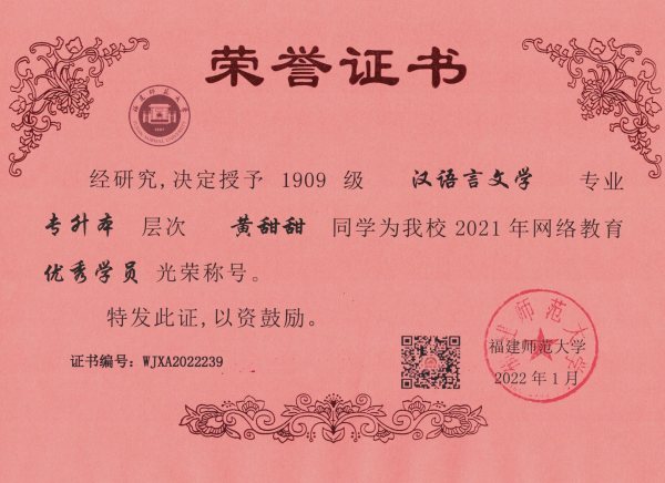 福建师范大学网络教育学院南充开放大学学习中心学生刘婷、蒋晶晶、黄甜甜、李蕊竹,荣获福建师范大学2021年网络教育“优秀学员”光荣称号。