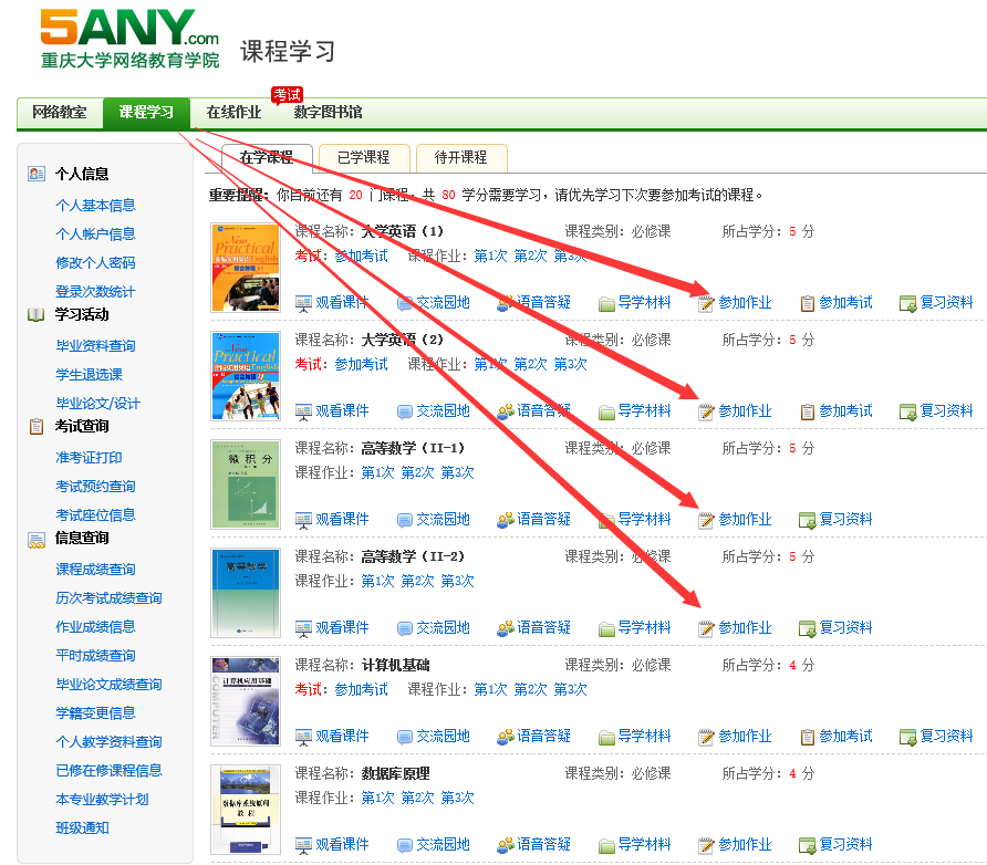 你们作业成绩要占课程总成绩的20%,网上学习的情况,学习平台系统会自动记录,并占总成绩的10%,所以你们要很好的完成每门课程的三次作业和经常登录你们的网络教室学习。完成作业可点击"在线作业"进入作业页面,也可点击课程后的"参加作业"进入该页面(如下图红箭头所指示)。