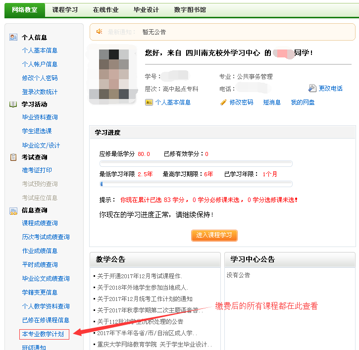 进入网络教室后,你们就进入了各自的学习主页,进行课程学习就点击"课程学习"选项(如下图红箭头所指示的选项)。进入"课程学习"后,你们就能看见各自要学习的课程了。学费全部交清的同学,你所有的课程都会开设出来,只交了一学年学费的同学,只有一半的课程出现在你的教室里。