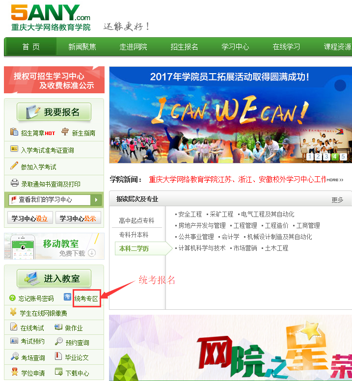 凡是本科学生(本科二学历的学生除外)都要参加《英语》B和《计算机应用基础》的统一考试(简称统考),四十岁以上(以报名录取时的时间为限计算)的同学《英语》B免考。参加统考的学生,考前需要报名,你们可以在学习平台上自已报名(从下图红箭头所示的选项进入),也可以到班主任那里报名,收费都是35元/科。报名时间学习平台上的"公告栏"会有通知,班主任也会通过短信、微信、QQ通知你们。