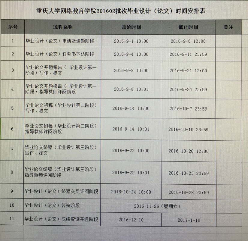 本科学生根据不同专业的要求,要完成毕业设计或毕业论文。申请学位的同学,毕业设计(论文)成绩要达到良好(含良好)以上,并通过答辩。毕业设计(论文)是分阶段在学习平台上完成的,其每个阶段的大致时间和任务如下(仅供参考):