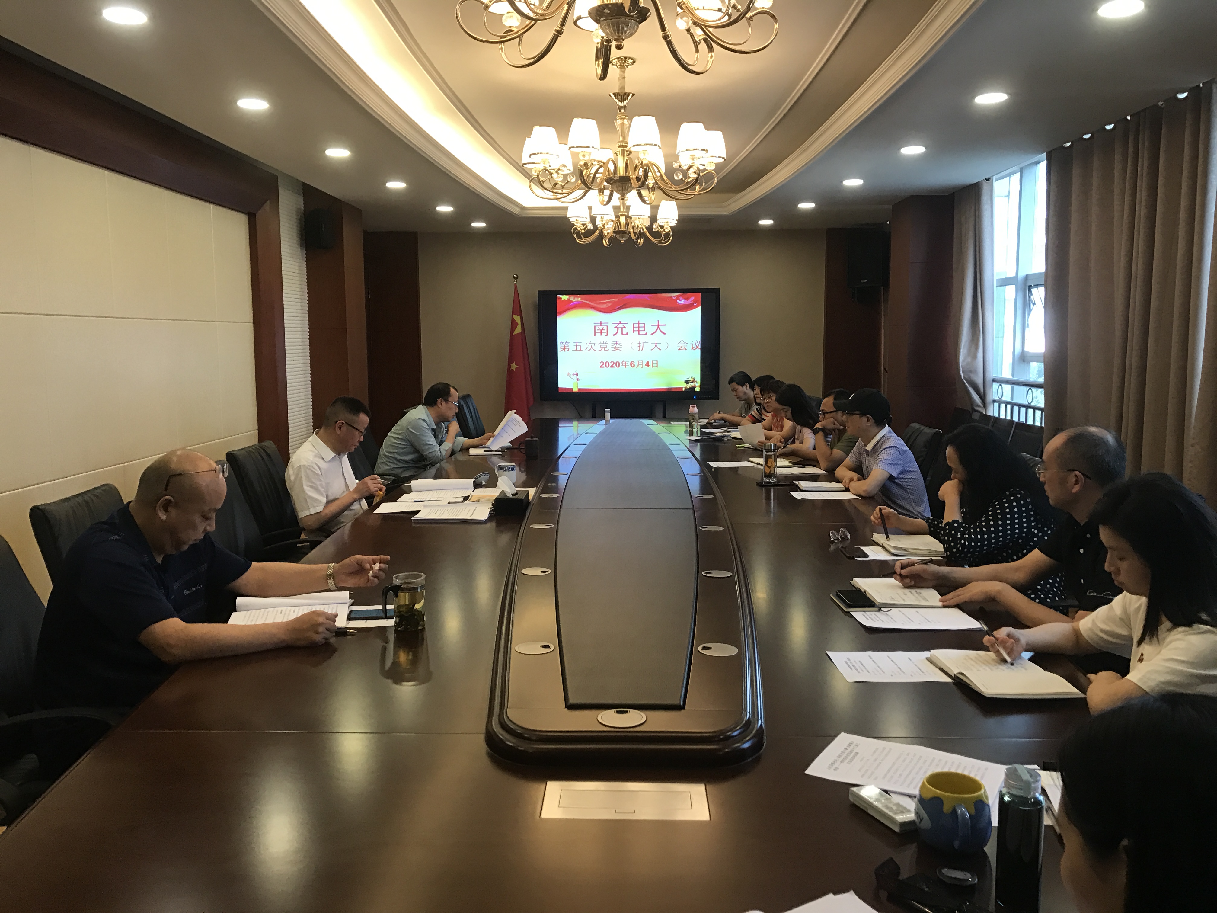 2020年6月4日下午,南充电大党委召开第五次党委(扩大)会议,集中学习传达全国两会精神。党委书记、校长昝平主持会议并作讲话,校级领导、中层干部共15人参加会议。
