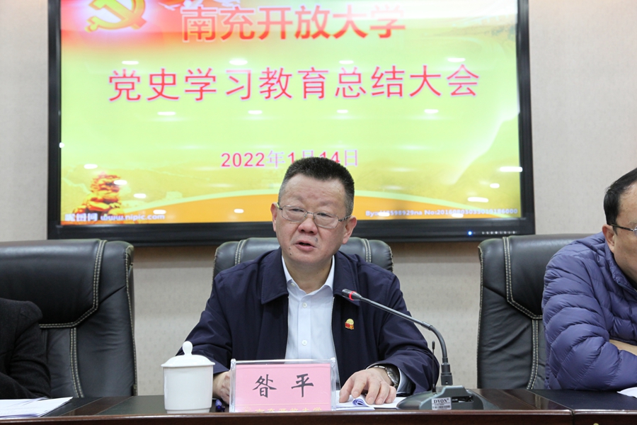 昝平指出,一年来南充开放大学以“学党史、悟思想、办实事、开新局”为引领,各项工作取得显著成绩,在四川开放大学系统年度总结大会上,荣获“2021年度业务工作综合奖一等奖(第一名)”等各种奖项共计13个,成为获奖等次最高、获奖项目最多的市级开放大学;2021年千方百计建成了“南充市普通话水平测试站”,为南充市民学普、推普、用普助力;2021年践行“数据多跑路,学生少跑腿”的理念,建设智慧校园,开发推出了学生线上交费系统,为师生服务再上新台阶。昝平强调,下一步,南充开放大学将充分运用党史学习教育取得的各项成果,聚焦深学细悟做实习近平新时代中国特色社会主义思想,聚焦贯彻落实党的十九届各次全会精神,聚焦立德树人根本任务,在奋力争创“国家级示范市级开放大学”新征程中作出新的更大贡献。