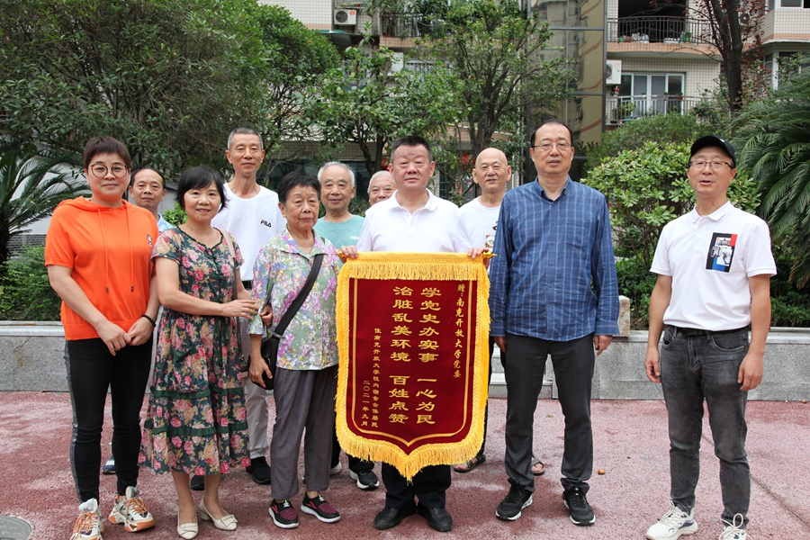 9月6日,住在南充开放大学宿舍区的全体居民,给南充开大党委送来一面书写着“学党史办实事一心为民、治脏乱美环境百姓点赞”的锦旗,为南充开大党委学党史悟思想,办实事解民忧的事迹表达由衷的感谢。