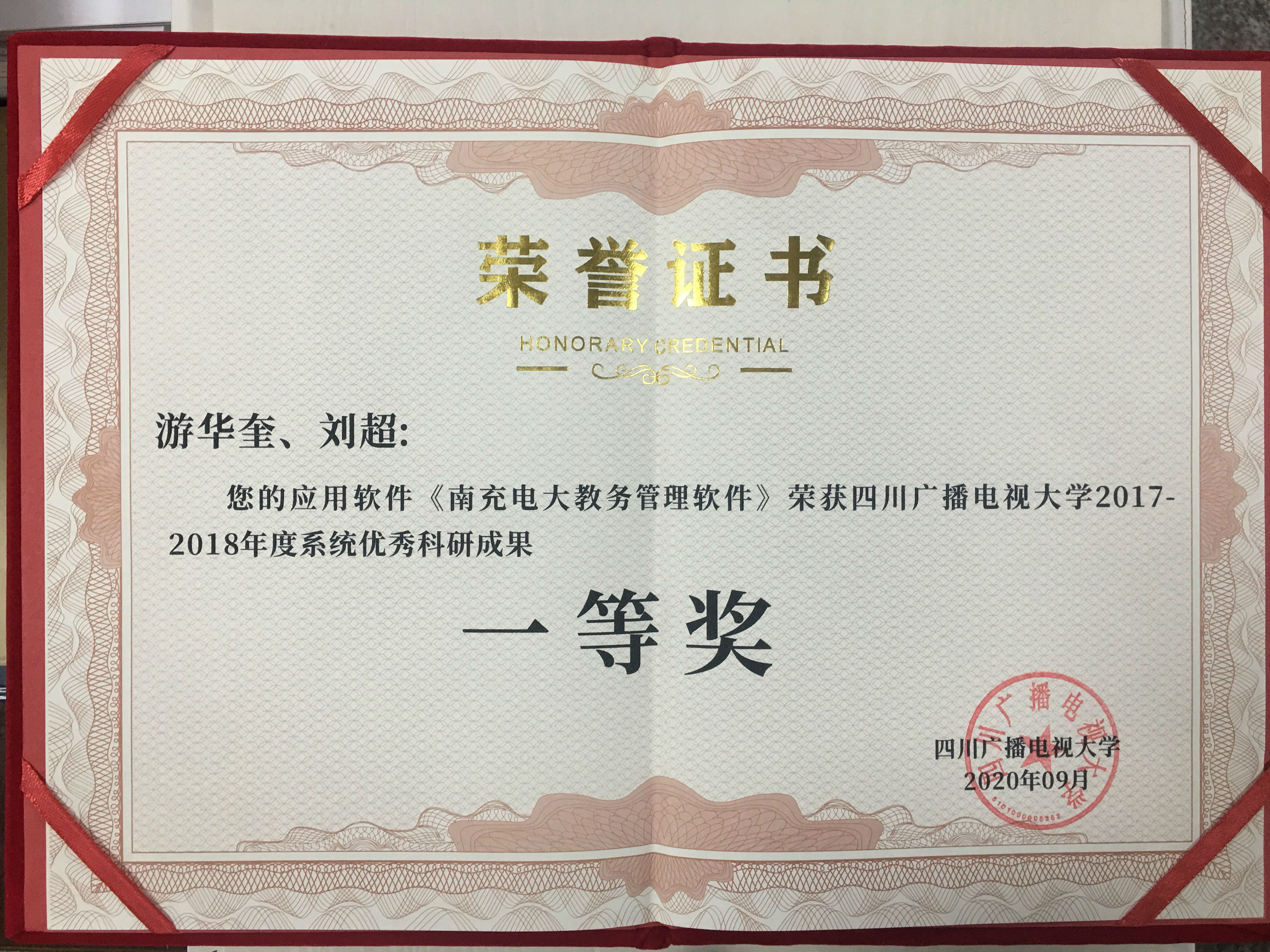 会议对全省电大系统2017-2018年度优秀科研成果和优秀集体进行了表彰。我校再次被评为科研工作优秀集体,王旗的著作《汉语言文学概论》获学术著作出版奖,游华奎、刘超负责的科研项目《南充电大教务管理软件》开发及应用获科研成果一等奖,王旗的论文《语录体与对话录:东西方不同语言表达形式的成因》获科研成果三等奖,唐琪、彭光源、张译之、郭婧4位老师获科研成果优秀奖。尤为可喜的是将科研成果一等奖和学术著作出版奖收入囊中,一举填补了过去的空白。