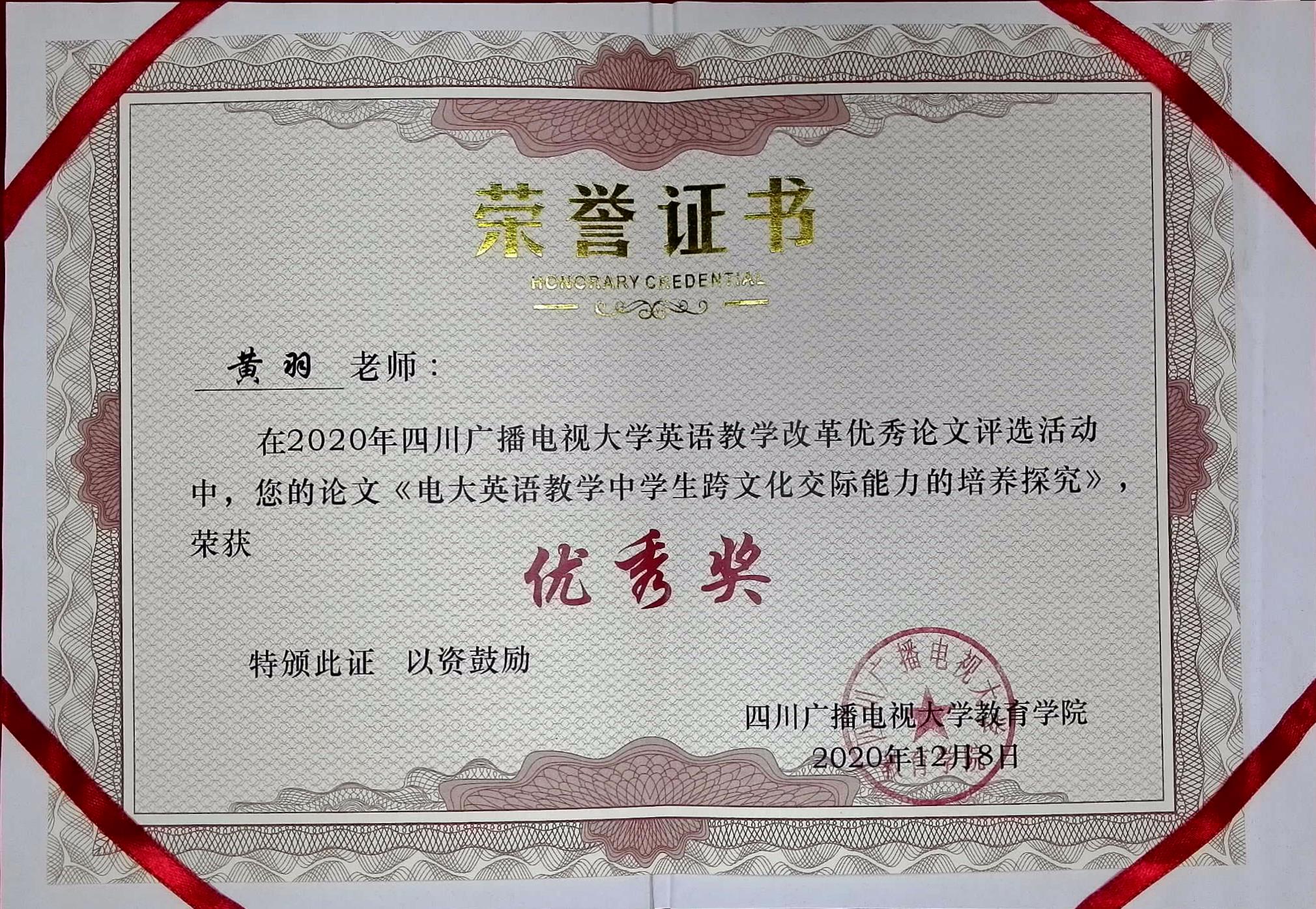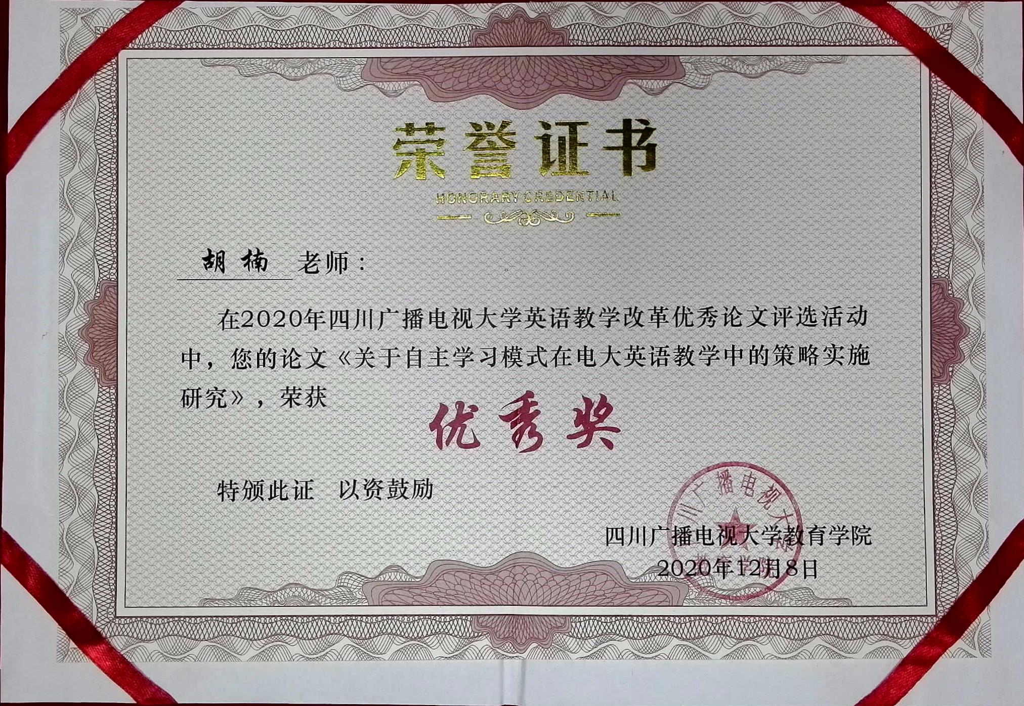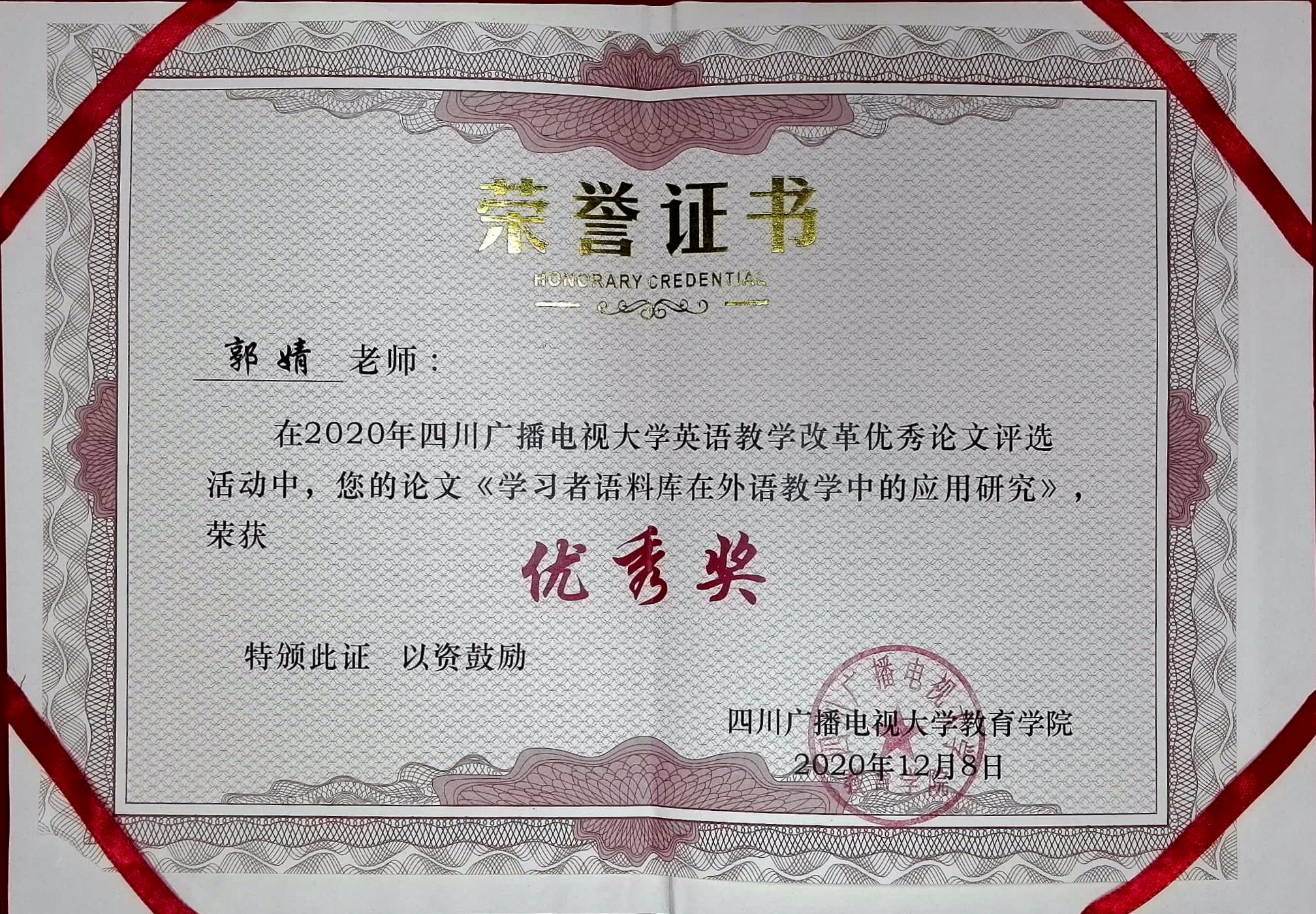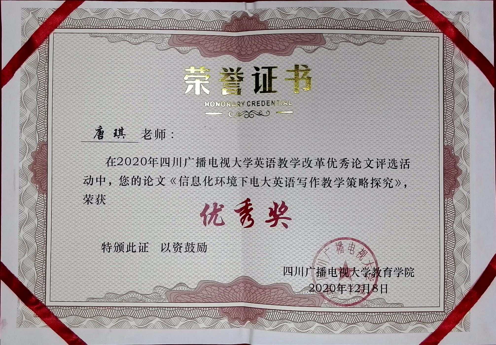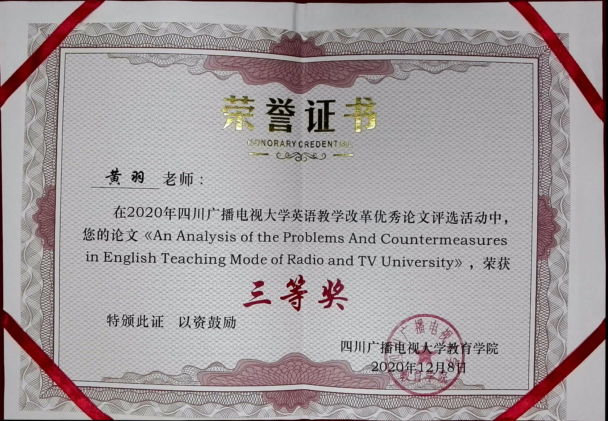 12月9日,四川电大英语教学改革优秀论文评选结果公布,我校4位老师报送的五篇论文成果,经过四川电大专家评委会的评审,均获得了奖励。其中,黄羽的《An Analysis of the Problems And Countermeasures in English Teaching Mode of Radio and TV University》获三等奖:黄羽的《电大英语教学中学生跨文化交际能力的培养探究》、唐琪的《信息化环境下电大英语写作教学策略探究》、胡楠的《关于自主学习模式在电大英语教学中的策略实施研究》、郭婧的《学习者语料库在外语教学中的应用研究》获优秀奖,获奖总数位居市州电大第一。