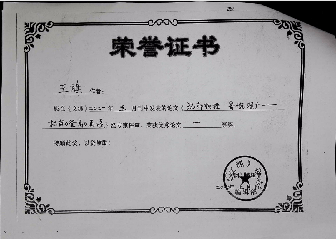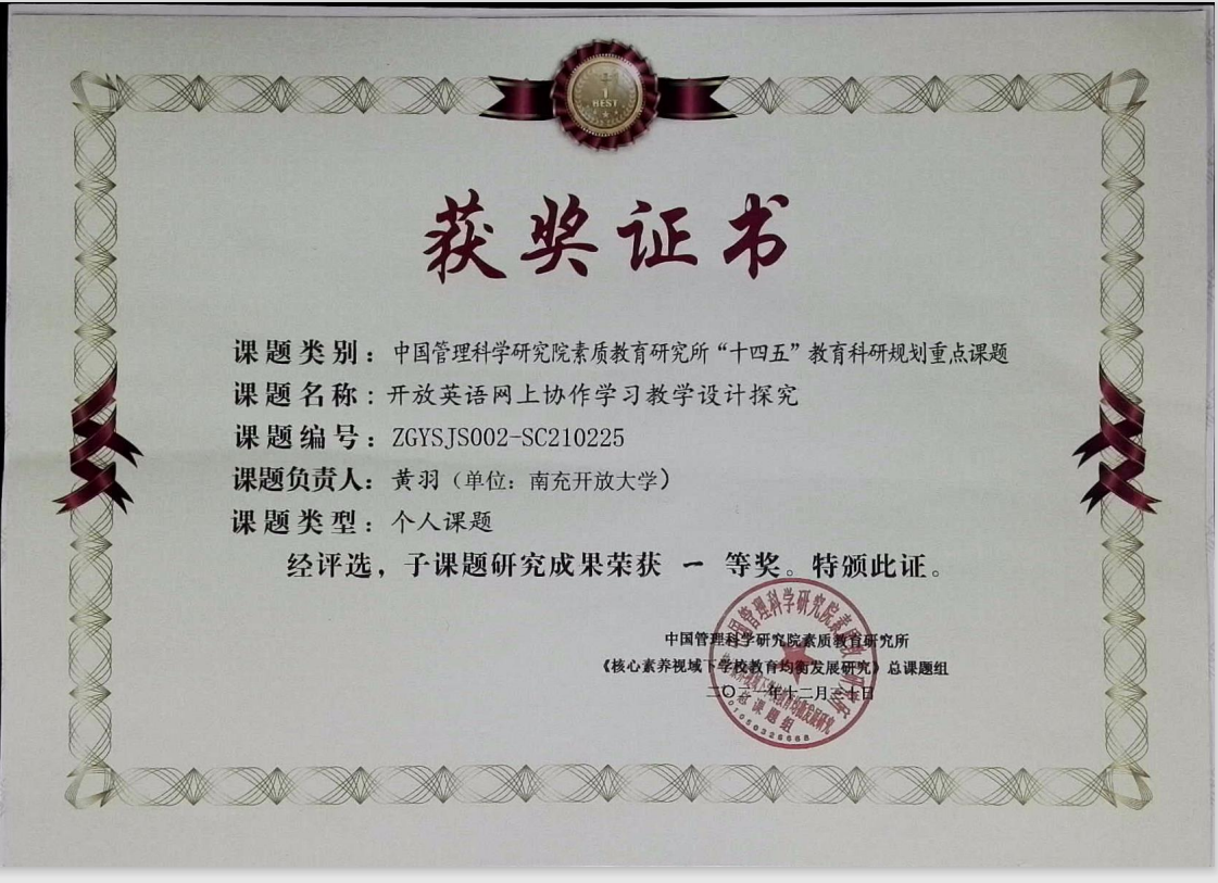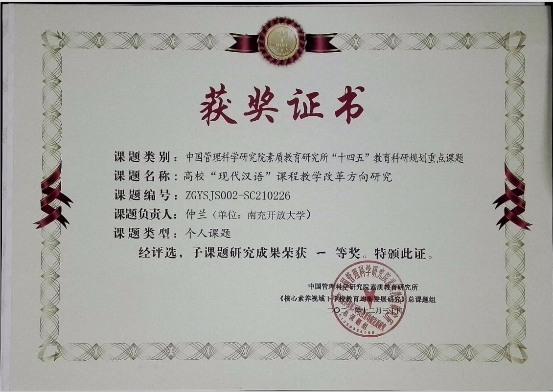 王旗的文章《沉郁顿挫 寄慨深广——杜甫《登高》再读》获文渊编辑部优秀论文一等奖;黄羽的课题《开放英语网上协作学习教学设计探究》、仲兰的课题《高校“现代汉语”课程教学改革方向研究》研究成果被评为中国管理科学研究院素质教育研究所“十四五”教育科研规划重点课题一等奖。